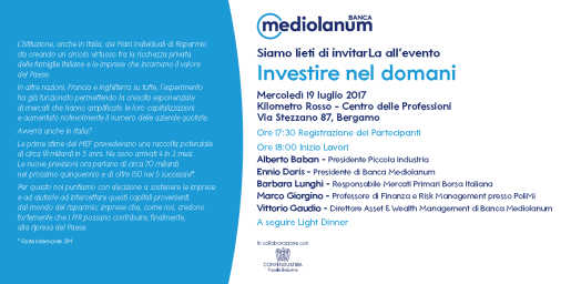 Il materiale ed i contenuti presente in questo sito non costituiscono in alcun modo sollecitazione al pubblico risparmio o un invito a sottoscrivere strumenti finanziari.