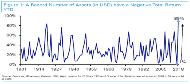 Novembre 2018 - Dall'inizio dell'anno 2018 , l' 89% delle asset class denominate in dollari ha avuto una performance negativa. E' un dato che non ha precedenti.