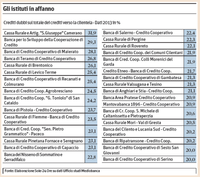 Febbraio 2015 - Il Sole 24 Ore : le 33 BCC con crediti malati sopra il 20%
