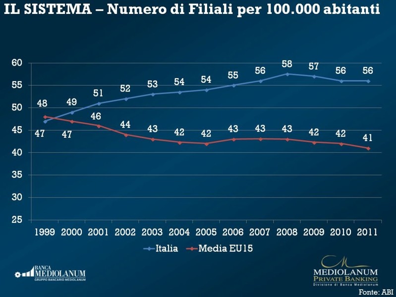 Gennaio 2012 - Numero di filiali per 100.000 abitanti Italia e EU 15