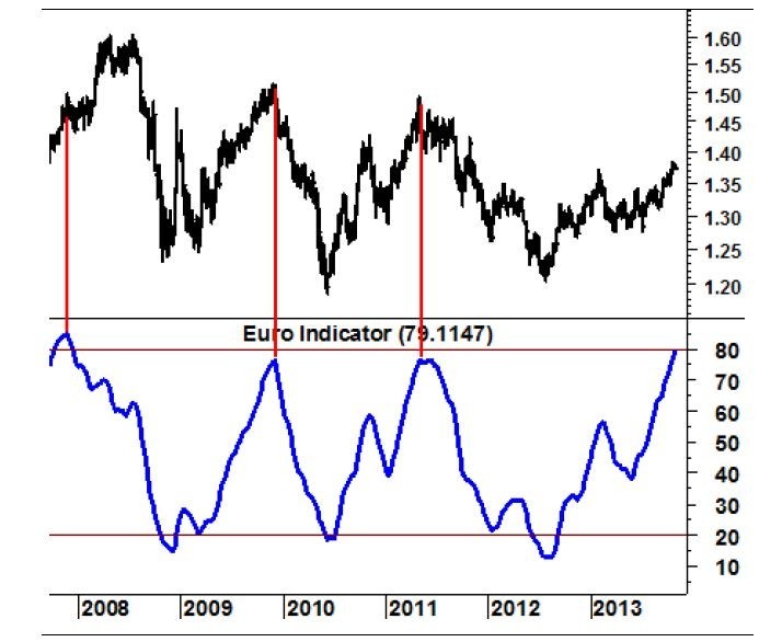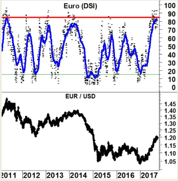 L'indicatore è la media di tre elementi: il saldo netto dei fondi hedge sull’euro future; il sentiment di tutti gli investitori,e la performance a 12 mesi
